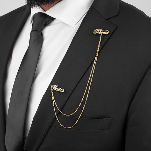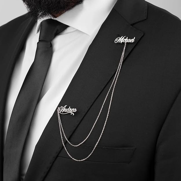 Make a bold style statement with our Name Chain Men Brooch, designed to add a regal and sophisticated touch to wedding and formal attire. Customized with your name or initials, this brooch is the perfect accessory for grooms, groomsmen, or anyone looking to elevate their outfit with a unique and elegant flair.